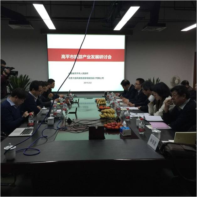 2016年2月26日,山西省高平市市長鄒樹琦、市委副書記鄧志蓉、市委宣傳部部長、市政府黨組成員牛曉明、市旅游文物局局長趙志敏、市規劃中心主任申書靈等到訪大地風景國際咨詢集團并召開高平市旅游產業發展研討會。大地風景首席科學家吳必虎教授、北京大地云游科技有限公司總經理王亞博、北京大地風景投資管理有限公司總經理吳朝陽、北京大地風景旅游景觀規劃設計有限公司事業一部項目總監于健、北京大地風景旅游景觀規劃設計有限公司合伙人趙俊峰等參與研討會。