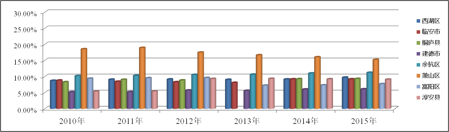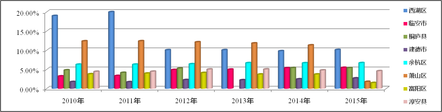 圖4:2010~2015年杭州市各地區旅游接待量占有率分析圖