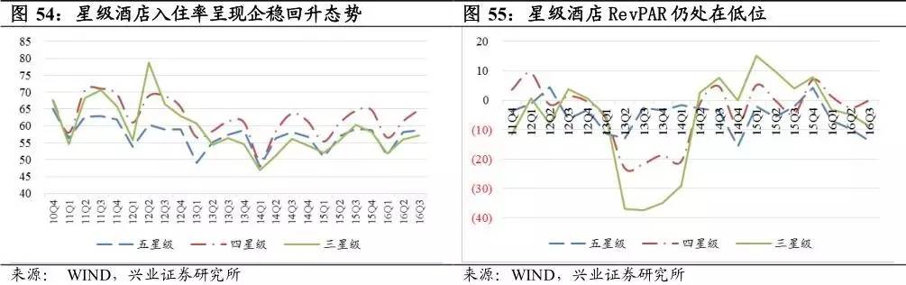 星級酒店:五星級酒店仍然面臨較大壓力,除15年Q4外,已連續16個季度下滑,但北上五星級酒店仍有小幅增長;四星級酒店逐步企穩回升,三星級酒店受到中高端酒店擠壓,出現下滑。