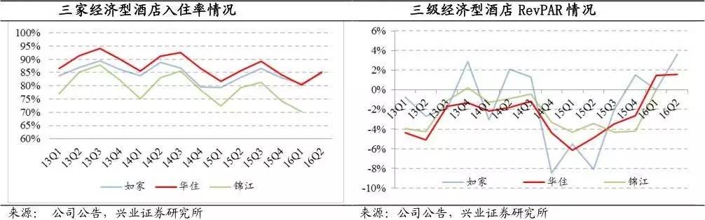 經濟型酒店對比,截止2016年上半年末,華住中高端酒店占比達到12.46%,其次為鉑濤和如家,從酒店運營指標來看,華住也是領先于如家和錦江。