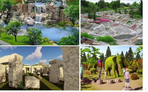 造石景,增加景源:結合景區水庫、臺地、林地等場地基底,通過理水疊石、創意植入巨型木雕、石雕、綠植裝置、石景墻等手法,增加新的旅游吸引物。
