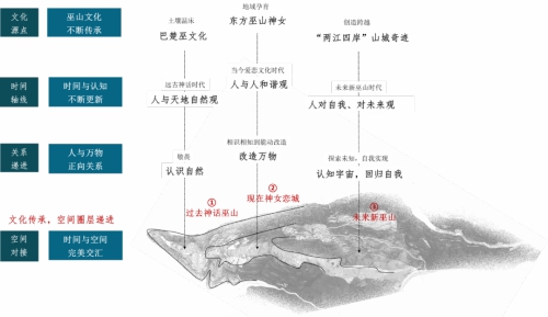 基于對巫山“中國戀城 · 神女巫山”品牌形象的強化需要,方案通過挖掘神女文化,對比東西方神女文化內涵,提煉出巫山東方浪漫精神氣質,并將其與場地空間功能、現代生活業態、項目名稱體系等進行有機嫁接。