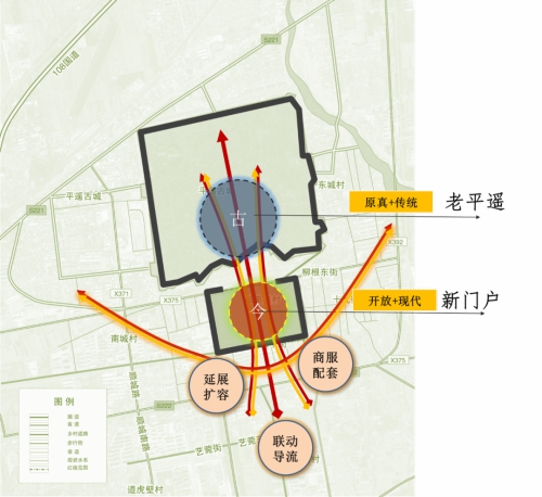 二是遵循“古城有機生長”的風貌協調原則,以“一線千年,貫古通今”為理念,以平遙城市沿革為文化脈絡,通過景觀的表達手法,打造進入古城前的文化風景游線,成為連接“雙城”的通道。