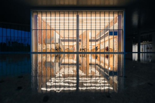 位于杭州的曉書館在良渚文化藝術中心內,又稱“大屋頂”,它的設計師是世界級的建筑大師安藤忠雄。館內有5萬冊圖書,由高曉松親自指導挑選。書館有一面落地窗外圍繞著淺水,一到夜晚,圖書館內的燈光、窗框、書格倒映在水面,風起微皺,波光粼粼,幻化成一場風與水與光的游戲。最夢幻的是,整個大屋頂環植著100多棵染井吉野櫻,每到暮春三月,美得像世外桃源。