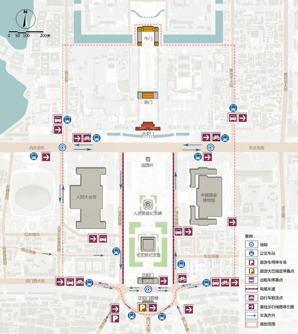 在旅游服務提升方面,方案分別以“智慧天安門、人本天安門、人文天安門、人和天安門”為命題,重點構建智能化旅游信息系統、人本化旅游設施系統、主題化廣場景觀系統和儀式化游賞組織系統,形成“一主三輔”四大旅游服務體系,全面提升天安門地區旅游服務品質。其中,“智慧天安門”智能化旅游信息系統,首次提出將GIS、無線網絡等現代信息技術運用到天安門地區的旅游信息發布、游客管理、環境監控、安全管理等各個方面,構建面向游客和管理者的雙向信息服務體系,從而實現天安門地區游賞服務和旅游管理的智能化,最大限度地解決由于天安門地區多頭管理并存、游客規模龐大、管理任務繁重、信息渠道不暢、游賞便捷性不足等帶來的諸多問題,形成了整個方案的創新亮點。在構建“一主三輔”四大旅游系統的基礎上,遠期還將實施“前門-廣場—故宮無障礙步行廊道打造工程、環廣場特色旅游交通系統構建工程、廣場東南片區旅游特色街區改造工程、廣場休閑綠地拓展工程、廣場地下旅游服務空間開發工程“五大遠期項目,將天安門廣場打造成為人民的廣場、時代的廣場、休閑的廣場和綠色的廣場。