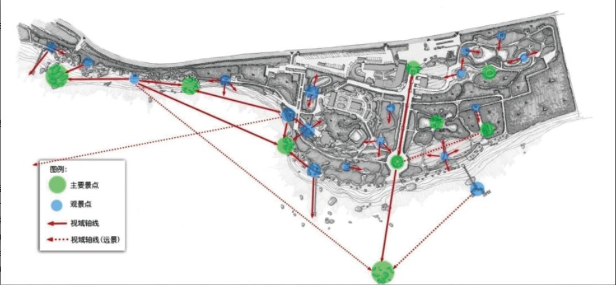 規劃的游客服務中心、售票廳、停車場、休憩園林和出口商業街等,將下客點、停車場入口和出口分置,有效疏散了出入口的交通。同時,為了實現人車分流,將道路按功能分級,設計了主干道、一級園路、二級園路,組織空間、引導、聯系并串聯景點及休憩場所。在游覽線路組織方面,通過串聯景區內主要景觀區域及景點,強調使用功能、景觀效果和游賞體驗。園路設置形成環線,觀賞面大,有利于游客游覽;有的園路設計成“斗折蛇形”或“一曲一改觀”,追求雋永深邃的意境,增加景區的空間層次。