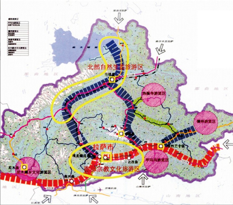拉薩作為藏傳佛教的中心,宗教文化對城市形態和建筑形式都具有深刻的影響。拉薩古城現狀以大昭寺為核心的放射狀街道格局,由于朝圣而形成的囊廓、八廓和林廓三條轉經環路,構成了古城的獨特城市肌理。規劃重視宗教文化在古城旅游開發中的地位和作用,提出將轉徑路打造為古城旅游系統的骨架,古城旅游的觀景廊道和游客古城體驗的線路。