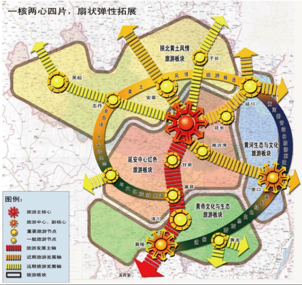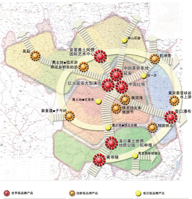 延安是舉世聞名的中國革命圣地,中華民族圣地,素以“兩黃(黃土文化、黃河文化)兩圣”旅游資源著稱于世,但目前旅游產品結構單一、同質化嚴重、區域競爭激烈,成為旅游發展的制約因素。針對這一問題,規劃提出了延安旅游的“品牌驅動”戰略,挖掘資源優勢,形成以“兩黃兩圣”為主的五大世界級旅游品牌、八大國家級旅游品牌和四大區域級品牌產品,實現從資源到產品的有效轉化。規劃設計的世界級旅游品牌產品包括:“天下第一陵”黃帝陵;“紅色圣地”延安革命文化遺產保護地;“天下黃河一壺收”壺口瀑布;“紅火延安”大型演出;安塞黃土風情國際藝術中心。