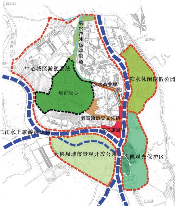 規劃面向“山城”、“佛城”一體化的目標,從大尺度出發,將大景區整合為點線面結合的時空統一體,打造城市之外的凈土。規劃確定的大景區空間結構為“一心兩翼六境”,其中一心為大佛核心旅游區;兩翼為島—河旅游翼和江—山旅游翼;六境分別為“塵世、圣域、人家、極樂、大佛、感悟”六大情景空間。