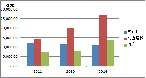2012年公司通過發行股票購買資產的方式取得世博出租車、云旅汽車、世博花園酒店及云旅酒店管理公司的100%控股權,2013年又實現了對麗江國旅的收購。在多元經營戰略的指導下,集團不斷拓展新業務,創造新的盈利點,旅行社、酒店、交通運輸三大業務的發展進一步優化了公司收入結構的配比,與旅游業務相關的交通、酒店、旅行社、景區等業務占到公司總營業收入的60%以上。2012-2014年之間,除了旅行社業受到國家宏觀政策的影響營業收入有所下滑,交通和酒店業務都呈現穩定增長。