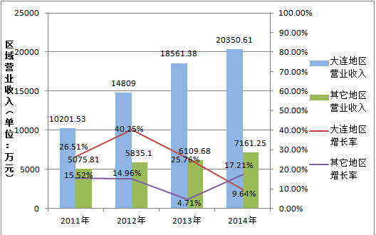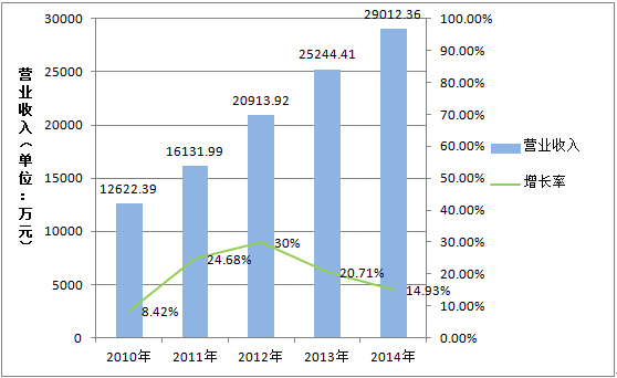 在該戰(zhàn)略的指導(dǎo)下,大連圣亞立足自身在海洋動(dòng)物孵化方面的技術(shù)優(yōu)勢(shì)和海洋動(dòng)物表演方面的產(chǎn)業(yè)優(yōu)勢(shì),以海洋和極地兩大文化旅游品牌的打造為引領(lǐng),積極構(gòu)建與相關(guān)領(lǐng)域上下游企業(yè)之間的合作平臺(tái),以豐富文化元素的注入和重組,不斷豐富核心產(chǎn)品的表現(xiàn)形式,提升品牌的競(jìng)爭(zhēng)力與市場(chǎng)吸引力。從2010年到2014年之間,大連圣亞一直處于穩(wěn)定的發(fā)展增長(zhǎng)期,年均營(yíng)業(yè)總收入增長(zhǎng)率保持在20%左右。