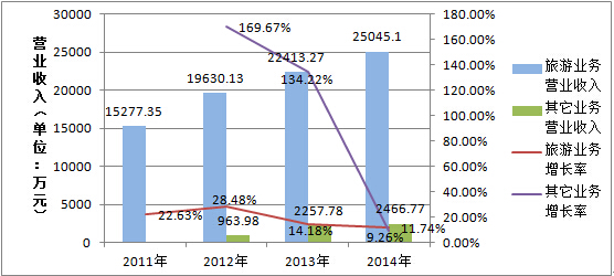 但綜合近年來(lái)的財(cái)務(wù)數(shù)據(jù)來(lái)看,旅游業(yè)仍是大連圣亞的絕對(duì)主營(yíng)業(yè)務(wù),占公司總營(yíng)業(yè)收入的90%以上,并且以年均約20%的速度穩(wěn)定增長(zhǎng)。其它業(yè)務(wù)自2012年起起才開(kāi)始出現(xiàn)明顯增長(zhǎng),增速雖高但并不穩(wěn)定。年報(bào)中并未提及其它業(yè)務(wù)的具體類別,這在一定程度上也說(shuō)明這些業(yè)務(wù)并未形成規(guī)模,短期內(nèi)仍難以與旅游業(yè)務(wù)并駕齊驅(qū)。