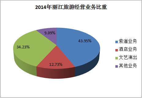 2014年公司核心業務板塊仍為索道運輸、酒店經營和印象演出三大塊。報告期內,索道運輸業務共實現營業收入32,644.4萬元,占公司營業總收入的比重為43.95%;酒店業務共實現營業收入9,455.95萬元,占公司營業總收入的比重為12.73%;印象演出業務共實現營業收入25,426.86萬元,占公司營業總收入的比重34.23%。