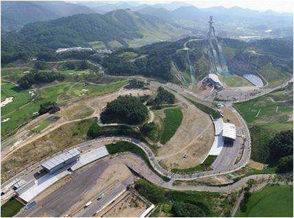 圖2平昌冬奧會比賽場館設計圖 韓國作為一個國土面積小、資源有限的國家,在冬奧會場館的規劃設計上充分尊重了場地本身的特性,這是實現生態可持續的一大措施。國際景觀設計規劃團隊SWA公司,對韓國平昌2018年冬季奧運會核心區的各項設施進行了設計。總體規劃在創造激動人心的高質量比賽場館的同時,滿足一種“輕觸”的愿望。要創造吸引人的,高品質的設施,同時保持了這個丘陵地勢的森林的自然美景。設計團隊力求設計一個緊湊的場地,適于步行,坡度最小化,并廣泛的植樹造林,恢復航道。