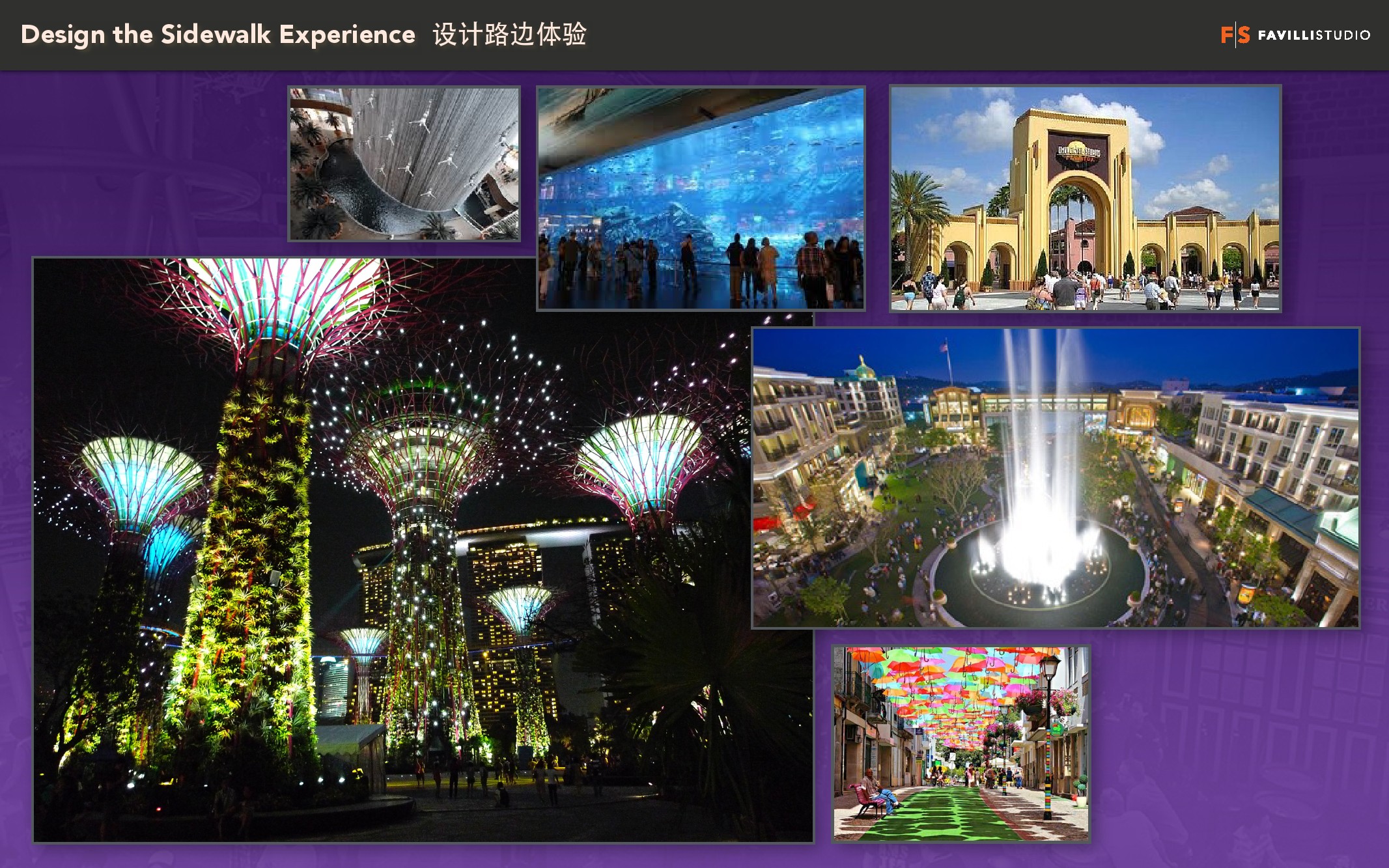 在做所有的設(shè)計之前,FS總是懷有一個基本的信念,即主題設(shè)計、場景設(shè)計以及建筑設(shè)計都根植于一個良好的故事,這個故事會影響到設(shè)計過程當中的一切細節(jié),并且牽涉到空間的轉(zhuǎn)變。包括在空間中對于行為的控制,以及對于能夠激發(fā)游客情感共鳴的其他元素的使用,包括顏色、線條、材質(zhì)、圖標等。這一重要的轉(zhuǎn)換從項目的門口就開始了,或者說從游客所接觸到的第一個點就開始了,這個第一印象同樣會成為游客最后一個印象。因此,大家對世界上最成功的旅游目的地總是不斷的對他們的街邊體驗進行更新。