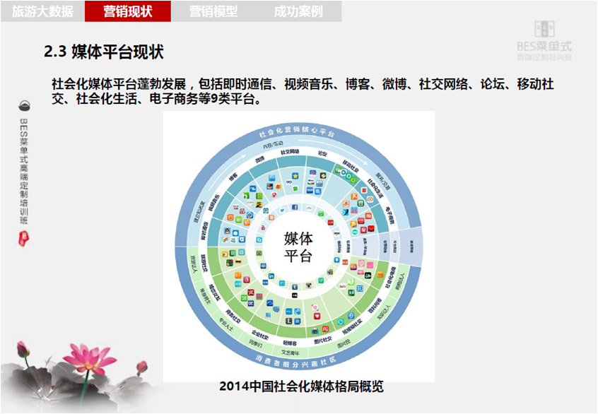 右邊這個閉環是通過游客出游習慣產生的一個數據的生態閉環。比如我們剛剛有了一個出行的想法要到陽澄湖玩,可能就會搜索陽澄湖,哪個好玩,怎么去,這就是我們大數據第一輪的數據采集。我們會通過百度、360、搜狗、google上面的數據把這一類對目的地搜索的這部分人群錄入到蘇州的旅游數據庫,緊接著他搜索完以后會在OTA上面采購機票和酒店,這一類的數據也進入到了我們的數據庫。再往下走是他要來了,如果是自駕來的會有手機導航,打車來的話也會有打車軟件的定位。接下來在大眾點評上訂的餐廳、買的代金券以及在景區里面打開的手機的導覽、導航,在到后面游玩過程中通過微信、微博,發一篇微博說這里太美了,或者說這里的飯很難吃,這些都已經進入到旅游大數據庫里面。或者他回到家里面以后對當地的旅游紀念品進行了線上的購買,例如在淘寶、天貓上線上的購買,最后再到百度旅游寫一篇游記,最后再回到搜索的起始點上形成了完整的數據閉環。這些數據已經進入到了旅游的大數據庫。這些數據對旅游的管理、旅游營銷、旅游的經營過程和規劃都有很好的指導意義。