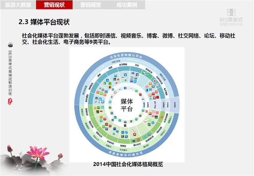 下面我們要講的是如何來基于大數(shù)據(jù)精準(zhǔn)你的媒體營銷。從媒體營銷的傳播途徑來講,實際上就分為兩大板塊,第一塊傳統(tǒng)的媒體,包括電視媒體、廣播媒體、戶外廣告、紙媒等。搜索引擎是網(wǎng)絡(luò)媒體很重要的組成部分。然后就是OTA我們叫做線上旅行社,攜程、去哪這些都是,從旅游目的地的角度來講,他們是我們很好的傳播途徑。然后是旅游社區(qū)、視頻網(wǎng)站、社交網(wǎng)站、自媒體,構(gòu)成了我們相對比較完整的網(wǎng)絡(luò)的媒體平臺的營銷體系。(注:因涉及商業(yè)機密,PPT內(nèi)容暫不公開)