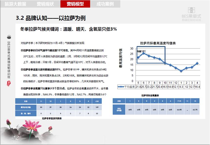 說執(zhí)行,我們先說品牌認(rèn)知,品牌認(rèn)知我們?nèi)ツ昴甑讋偨o拉薩市做了冬季營銷的精準(zhǔn)方案,我們可以看一下。這先說拉薩,我們做數(shù)據(jù)分析,第一是網(wǎng)民對它的氣候認(rèn)知度的數(shù)據(jù),這里面有兩個問題,第一個問題是都說拉薩,我相信在座的各位都覺得冬天去拉薩太冷了,但是拉薩的平均氣溫是13度。第二個問題說拉薩冬天的含氧量太低了,拉薩平均含氧量冬季比夏季低3個百分點,從科學(xué)的角度來講你冬天去有高原反映,夏天去一樣有高原反映,這是跟人有關(guān)系,跟含氧量的關(guān)系并不是特別大。所以拉薩的冬天也是非常適合旅游的,而且目前來講冬天的酒店更便宜,冬天的人更少,冬天的天更藍(lán),冬天的陽光更明媚。