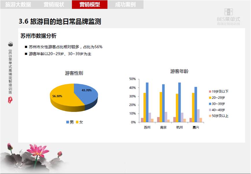 比如說對于蘇州來講人均GDP、交通入網(wǎng)的覆蓋情況、景區(qū)的數(shù)量、地理、氣候、海拔、植被,包括居民的消費能力,當(dāng)?shù)氐木频旰筒惋嫷墓┙o情況,通過我們的數(shù)據(jù)模型和數(shù)據(jù)分析找到你的核心客源地市場,就是哪個城市來你這里旅游的人最多,然后在江蘇省內(nèi)的競爭指數(shù),包括潛在客源地市場,包括市場洼地和漏損市場。漏損市場就是這個城市,比如說來蘇州旅游的,比如說上海,它對你的搜索熱度是非常高的,當(dāng)?shù)厝说某鲇瘟?xí)慣也非常高的,它的休閑度假的要求也是非常多的,但是它的轉(zhuǎn)換率并不高。比如說有1億人次關(guān)注、喜愛過你,結(jié)果轉(zhuǎn)換過來以后只有100萬,這個轉(zhuǎn)換率非常低。如何提升你的轉(zhuǎn)換率,要通過后續(xù)的營銷手段,供給側(cè)的產(chǎn)品調(diào)整吸引你的潛在客戶或者是洼地。這里我們可以看到游客的年齡構(gòu)成、游客的性別、興趣偏好、學(xué)歷、職業(yè)、包括他每年在網(wǎng)上每個時期對你搜索的熱度。