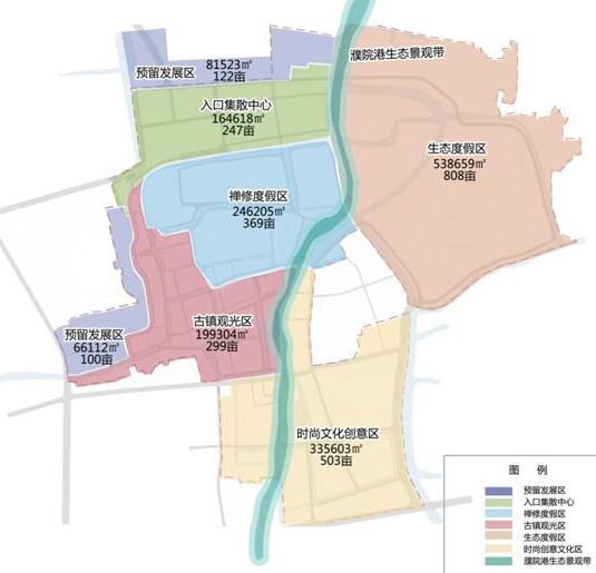 在空間布局上,按照古鎮(zhèn)為核、文化為脈、產(chǎn)業(yè)集聚的理念形成了“一帶·五區(qū)”的空間格局,即濮院港生態(tài)景觀帶;入口集散區(qū)、古鎮(zhèn)觀光區(qū)、禪修度假區(qū)、時尚文化創(chuàng)意區(qū)、生態(tài)度假區(qū)。層次分明、主題明確、形成區(qū)域均衡發(fā)展的空間態(tài)勢。