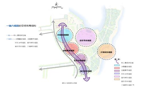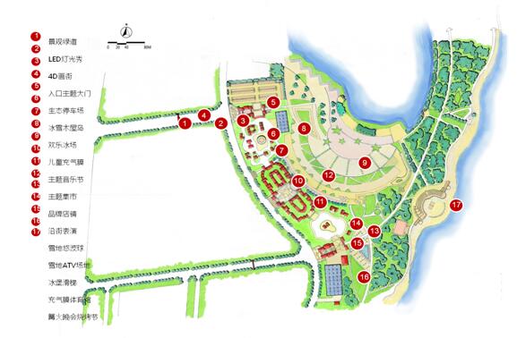 以一條創意景觀軸串聯六個組團,形成共生相聯、各具特色的組團系統。一軸即核心景觀體驗軸,六組團包括冰雪童話組團、主題集市組團、歡樂冰場組團、室內娛樂組團、音樂節慶組團、沙灘娛樂組團。