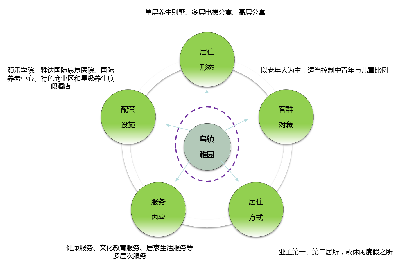 養(yǎng)老地產(chǎn):頤樂學(xué)院、國際養(yǎng)老中心、養(yǎng)生居住區(qū);具體包括中式單層養(yǎng)生別墅、新民國風(fēng)多層電梯公寓、高層公寓和頤樂學(xué)院四種物業(yè)形態(tài)。