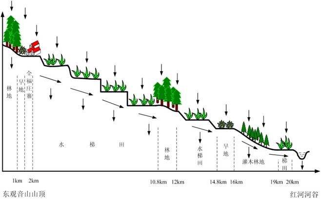 哈尼人對水資源的認識和管理是非常智慧的。有個人在高山上繞了半天最后跑來問我,“山上沒有水庫,這個水是怎么上去的?”我說:“水從天上來,云霧就是我們的空中大海,森林就是我們的綠色水庫。”一年一度的印度洋、南太平洋季風性氣候帶來的雨水儲存在在綠色的水庫里面,滲透到地下看不見的水庫砂石層里面,水就慢慢流下來,被聰明的哈尼人截流,開挖水渠、通過大溝、小溝再灌溉到梯田里面。流到低海拔的水受熱變水蒸氣蒸騰到高空,又被冷空氣截流,變成雨水降到森林里。如此循環反復。哈尼人很好地利用了這個自然生態循環,變為農業生態循環系統。