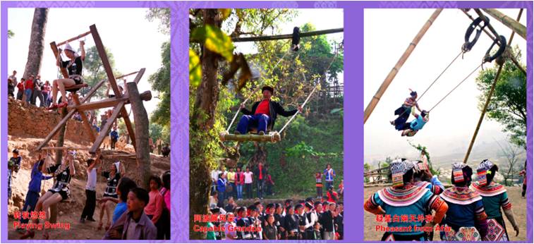 插完秧后,會過六月節,六月節會打秋千,轉轉秋,要有勇敢的人才能上這個秋千,這是一個放松的節日。一種說法是,大家累了需要休息,另一個是傳說,農耕的時候,小動物受傷了,他們跑到天神那里去告狀,天神說他們也是迫不得已,不過我會懲罰他們的,但是到了日子,天神偏袒哈尼人,就告訴大家,你們要叫“哎喲哎喲”,要殺牛留血,于是留下來了“殺牛、祭天、打秋秋”的說法。實際上這是一個祈禱豐收、“愚人愚神”的節日。