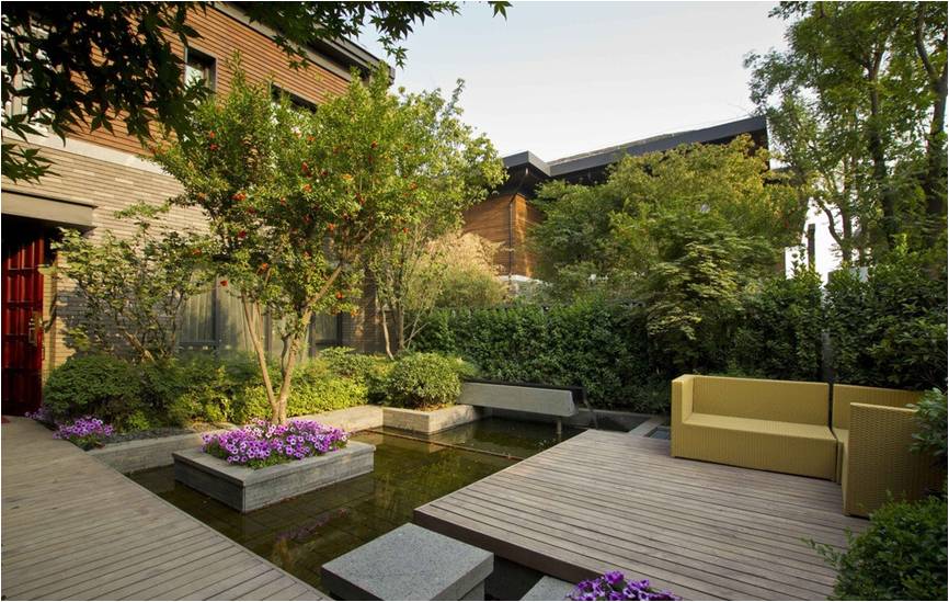 城市休閑庭院的景觀要素以圍合度較高的圍欄、現代風格形式的鋪裝、規則的水體、現代的景觀小品、舒適美觀的休憩設施以及生態科學的植物群落為主。適用于靠近城區、縣城、經濟重鎮,且鄉村文化不明顯的區域。這些鄉村交通便捷,人口稠密,經濟發展迅速,城鎮化程度較高,土地需求緊張,村民注重建筑更新。