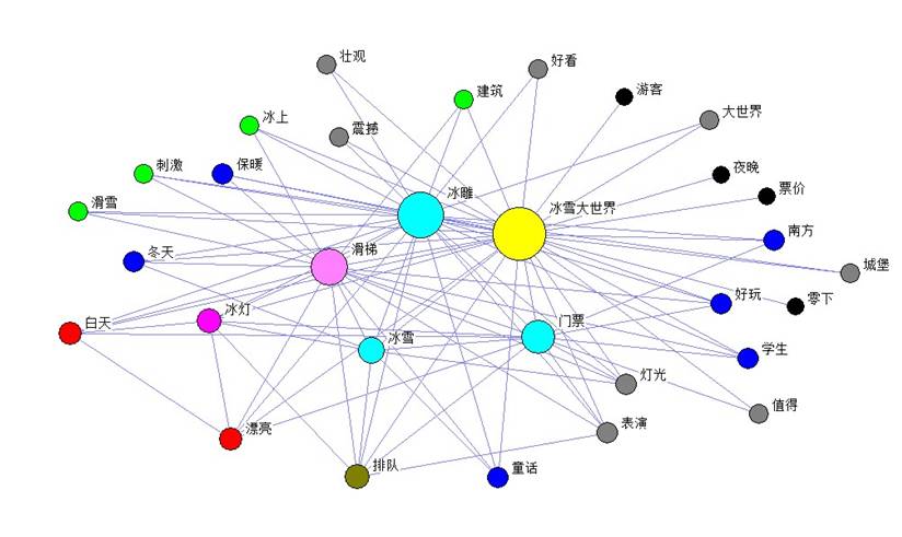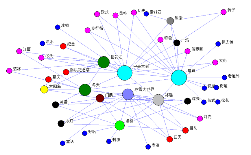 哈爾濱游客所發(fā)評論內(nèi)容主要圍繞“中央大街”、“冰雪大世界”、“松花江”、“建筑”、“俄式”等關(guān)鍵詞展開。其中,以“滑梯”、“冰雕”為中心的關(guān)鍵詞群反映了游客對于哈爾濱特殊的地理、氣候資源認知;同時,“美麗”、“風(fēng)情”、“漂亮”等關(guān)鍵詞為中心的詞組反映了哈爾濱給游客留下的整體認知是正面、積極的形象,城市網(wǎng)絡(luò)口碑較好。