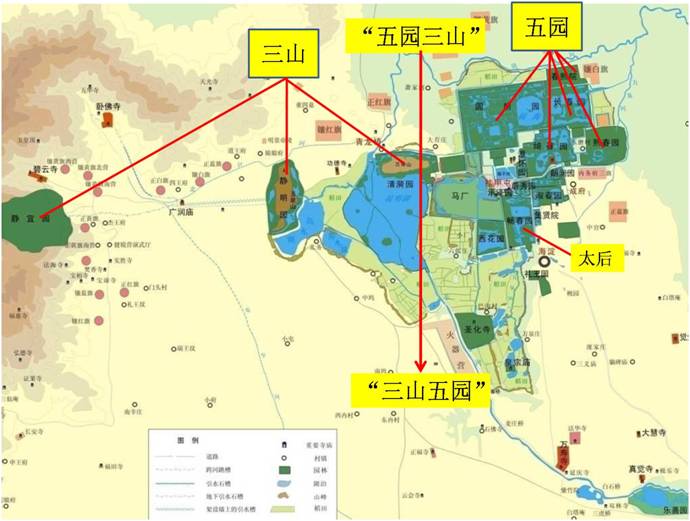 上圖反映的是歷史時期三山五園的大致范圍,與今天的三山五園歷史文化景區大體相似。所異的是,今天的三山五園歷史文化景區沒有包括南邊的那部分——長河景區。另外,又把望兒山一帶納入進來,畫蛇添足,這在一定程度上改變了歷史上三山五園地區的內涵。