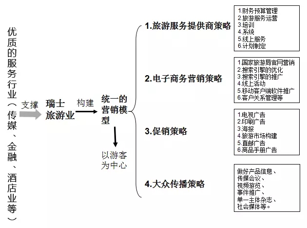 瑞士旅游業(yè)營銷策略絕不只是旅游業(yè)單槍匹馬在實(shí)施。瑞士庫爾技術(shù)與經(jīng)濟(jì)學(xué)院旅游管理專業(yè)的Peter Tromm教授曾提到,“旅游業(yè)的發(fā)展必須保證整個(gè)服務(wù)鏈條上的所有產(chǎn)業(yè)都保持同樣的高質(zhì)量標(biāo)準(zhǔn)。瑞士旅游業(yè)構(gòu)建了統(tǒng)一的營銷模型,以游客為中心,充分注重游客分享帶來的傳播效應(yīng)。整個(gè)模型包括旅游服務(wù)提供商策略,電子商務(wù)營銷策略,促銷策略和大眾傳播策略四大模塊。”更多詳情,請(qǐng)看下圖: