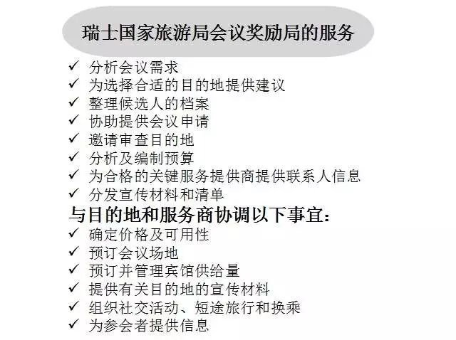 瑞士國家旅游局會(huì)議獎(jiǎng)勵(lì)局(SCIB)是瑞士的一個(gè)國家級(jí)非盈利組織,已成為頂級(jí)會(huì)議目的地、國際級(jí)活動(dòng)組織者和交通運(yùn)輸公司的代表。作為聯(lián)系樞紐,瑞士會(huì)議獎(jiǎng)勵(lì)署為客戶規(guī)劃在瑞士的活動(dòng),提供獨(dú)立的免費(fèi)支持,將瑞士作為理想的“旅游、會(huì)展和節(jié)事目的地”目的地加以推廣。下圖將解說瑞士國家旅游局會(huì)議獎(jiǎng)勵(lì)局提供的具體服務(wù):