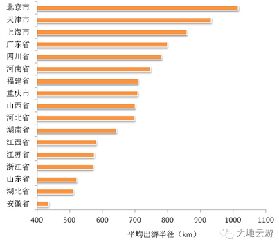 計算五一期間各省居民平均出游距離,北京人民最偏好遠行,平均出游半徑為1016公里;上海緊隨其后,平均出游半徑為857公里;廣東人民平均出游半徑為799公里;河南不愧是南北的交通樞紐,高鐵、普速都很便利,平均出游半徑僅次于北上廣;江浙滬平均出游半徑都不超過600公里,因為在家門口就能度假享美景。