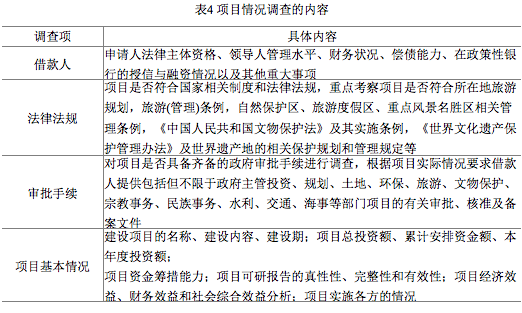 調查項具體內容借款人申請人法律主體資格、領導人管理水平、財務狀況、償債能力、在政策性銀行的授信與融資情況以及其他重大事項法律法規項目是否符合國家相關制度和法律法規,重點考察項目是否符合所在地旅游規劃,旅游(管理)條例,自然保護區、旅游度假區、重點風景名勝區相關管理條例,《中國人民共和國文物保護法》及其實施條例,《世界文化遺產保護管理辦法》及世界遺產地的相關保護規劃和管理規定等審批手續對項目是否具備齊備的政府審批手續進行調查,根據項目實際情況要求借款人提供包括但不限于政府主管投資、規劃、土地、環保、旅游、文物保護、宗教事務、民族事務、水利、交通、海事等部門項目的有關審批、核準及備案文件項目基本情況建設項目的名稱、建設內容、建設期;項目總投資額、累計安排資金額、本年度投資額;