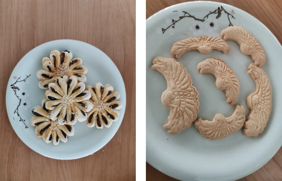 圍繞菊花和鶴的元素,有現(xiàn)場(chǎng)制作的菊花和鶴造型的點(diǎn)心和餅干。