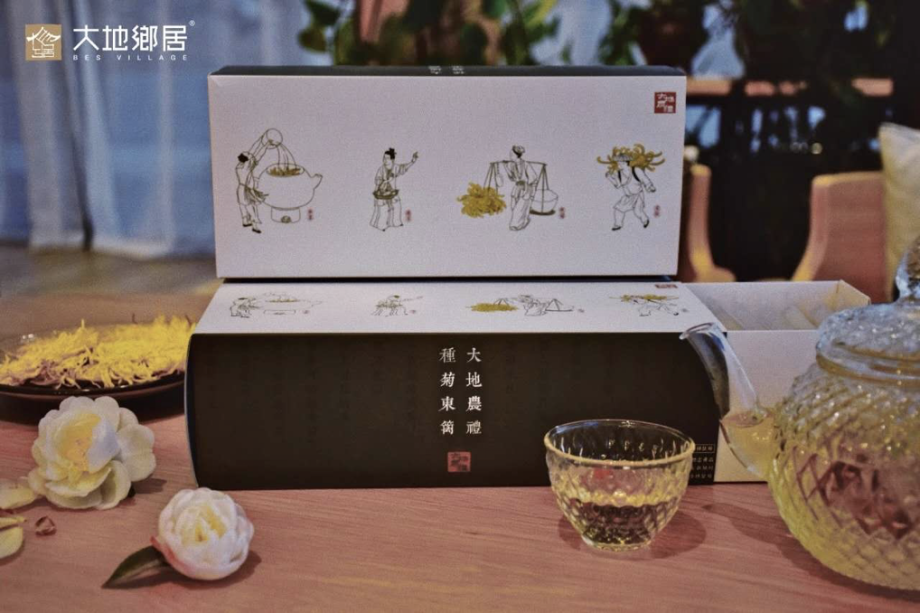 另一個(gè)例子是我們?cè)诖蟮剜l(xiāng)居鶴影里項(xiàng)目中開(kāi)發(fā)的大地農(nóng)禮金絲皇菊。菊花是當(dāng)?shù)胤浅V匾奶厣r(nóng)產(chǎn)品。我們從這個(gè)產(chǎn)品出發(fā),做了一個(gè)主題化的深度體驗(yàn)的鏈條,包括清晨去菊花田采菊,然后去菊花工坊進(jìn)行烘茶體驗(yàn),花田里的下午茶,以及文創(chuàng)茶飲的銷(xiāo)售,形成一個(gè)完整的鄉(xiāng)村文創(chuàng)體驗(yàn)閉環(huán)。