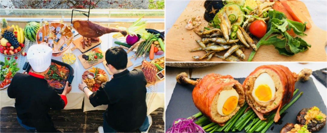 大家看到的這張圖,是以土家族的傳統(tǒng)風(fēng)物特產(chǎn),如臘肉、清江魚(yú)、莼菜等為基礎(chǔ),重新開(kāi)發(fā)的風(fēng)景食課菜品。用新的餐飲設(shè)計(jì)手法,對(duì)武陵山的山野特產(chǎn)和土家族的傳統(tǒng)烹飪進(jìn)行應(yīng)用。龍船調(diào)所在的利川是“中國(guó)山藥之鄉(xiāng)”,在這里山藥被制作成了山藥紫薯甜點(diǎn)。
