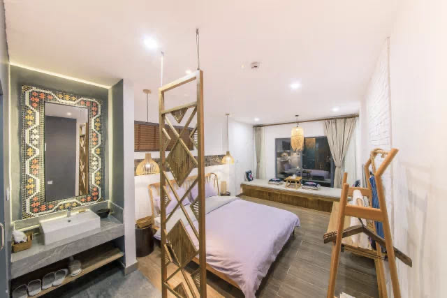 另外一個(gè)方向,是把西蘭卡普紋樣提取出來(lái)之后,應(yīng)用到房間的裝飾當(dāng)中,為客房定制了西蘭卡普屏風(fēng)。雖然它不是一個(gè)消費(fèi)品,但是它會(huì)用文創(chuàng)的方式讓顧客非常深刻的去記住和了解這個(gè)IP。然后我們?cè)匍_(kāi)發(fā)能夠銷(xiāo)售的產(chǎn)品,比如這個(gè)木板印畫(huà)的燈具。用版畫(huà)的手法去設(shè)計(jì)和印制燈具上的西蘭卡普?qǐng)D案,有古樸的民族風(fēng)格。這個(gè)燈具會(huì)在度假空間當(dāng)中使用,同時(shí)也可以應(yīng)用在日常的家居空間當(dāng)中。