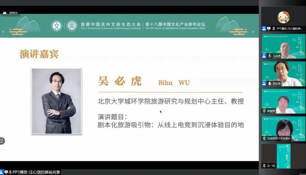 8月16日,2021首屆中國撫州文創生態大會暨第十八屆中國文化產業新年論壇以線上會場、北京大學、江西撫州線下分會場連線聯動的方式舉辦。北京大學城環學院旅游研究與規劃中心主任、文化和旅游部十四五規劃專家委員會委員吳必虎教授受邀出席并發言。