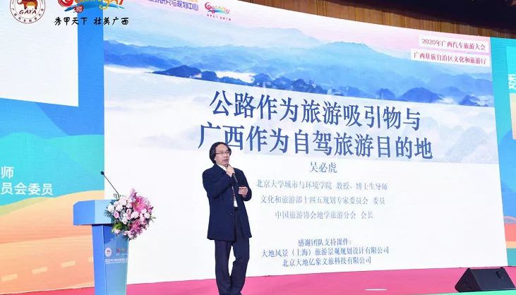 國際旅游研究院院士、文化和旅游部十四五規劃專家委員會委員、大地風景文旅集團首席科學家、北京大學教授吳必虎應邀出席2020年廣西汽車旅游大會,并發表了題為《公路作為旅游吸引物與廣西作為自駕旅游目的地》的主旨演講。